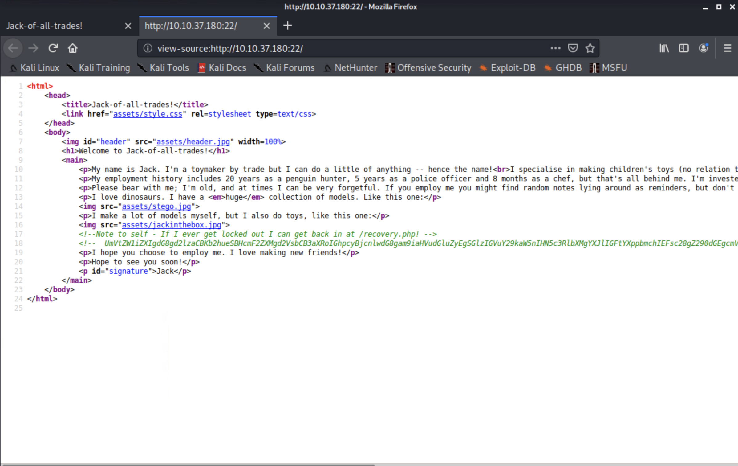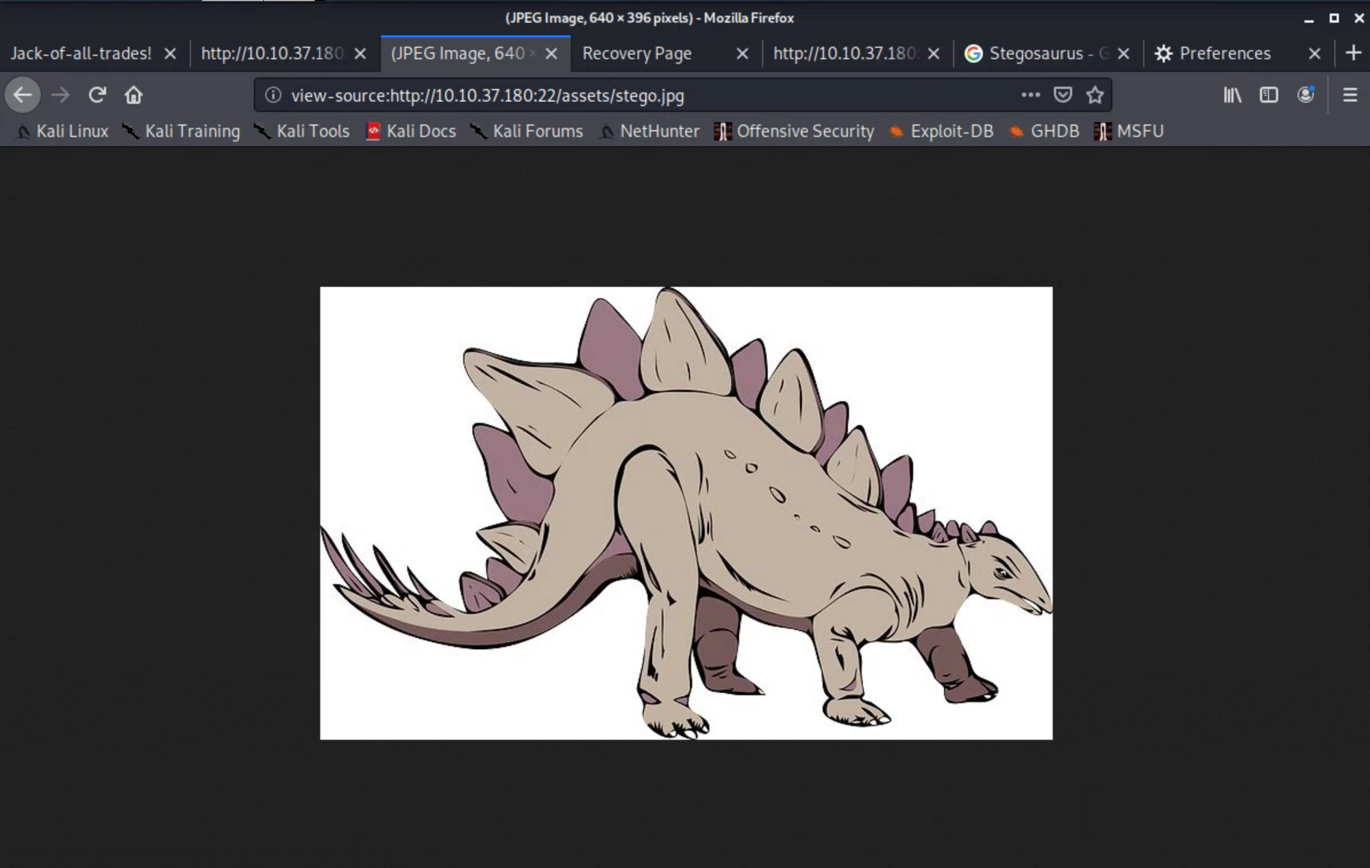 Later checking the web source code, I noticed a base64 and a note for the user Jack in case he forgets his credentials. I visited the site but the credentials we have doesn't work, I tried to guess the user since he loves dinosaurs, well after I found the name of the dinosaurs all I read was stego! let's download the images on the web and see what's hidden.