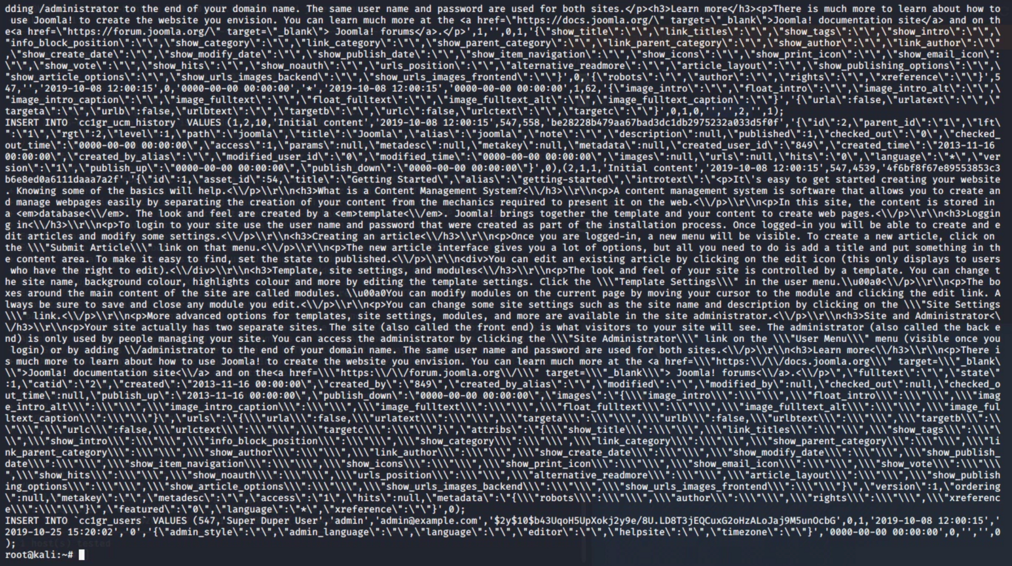 INSERT INTO `cc1gr_users` VALUES (547,'Super Duper User','admin','admin@example.com','$2y$10$b43UqoH5UpXokj2y9e/8U.LD8T3jEQCuxG2oHzALoJaj9M5unOcbG',0,1,'2019-10-08 12:00:15',
