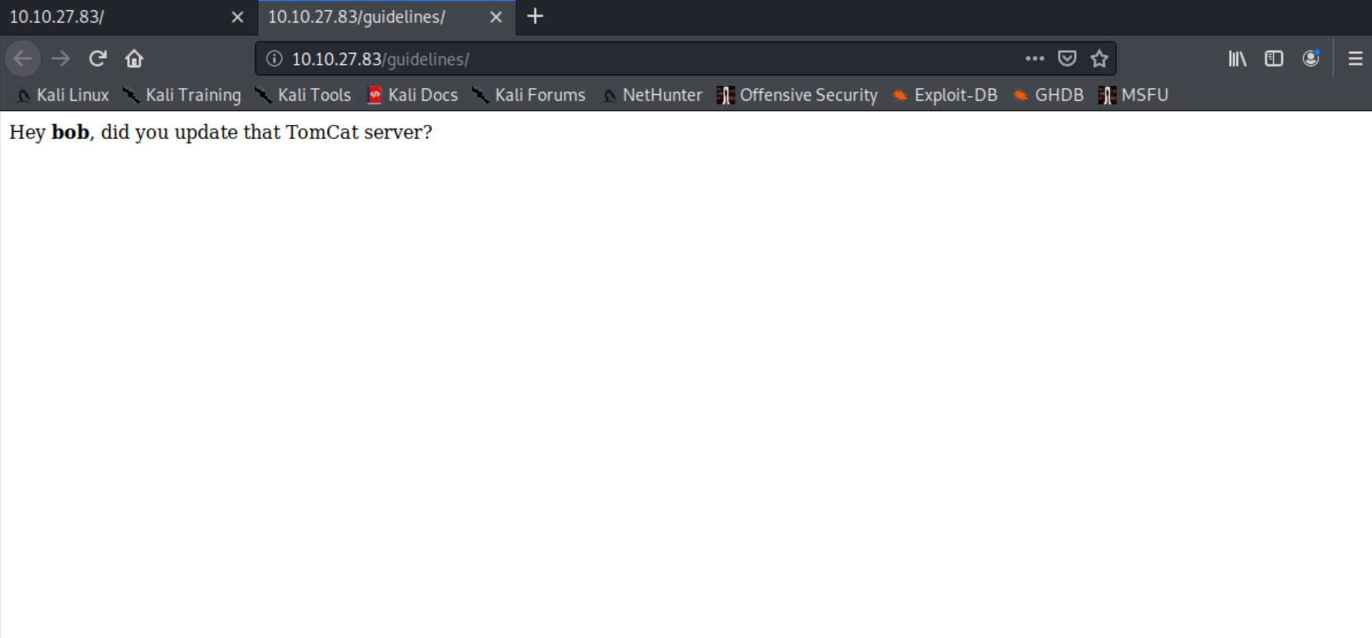 and we have a message in directory /guidelines for Mr bob that forgot maybe to update the Tomcat server and another one /protected that tells us that we are visiting the wrong port, that's fine because we have more in port 1234